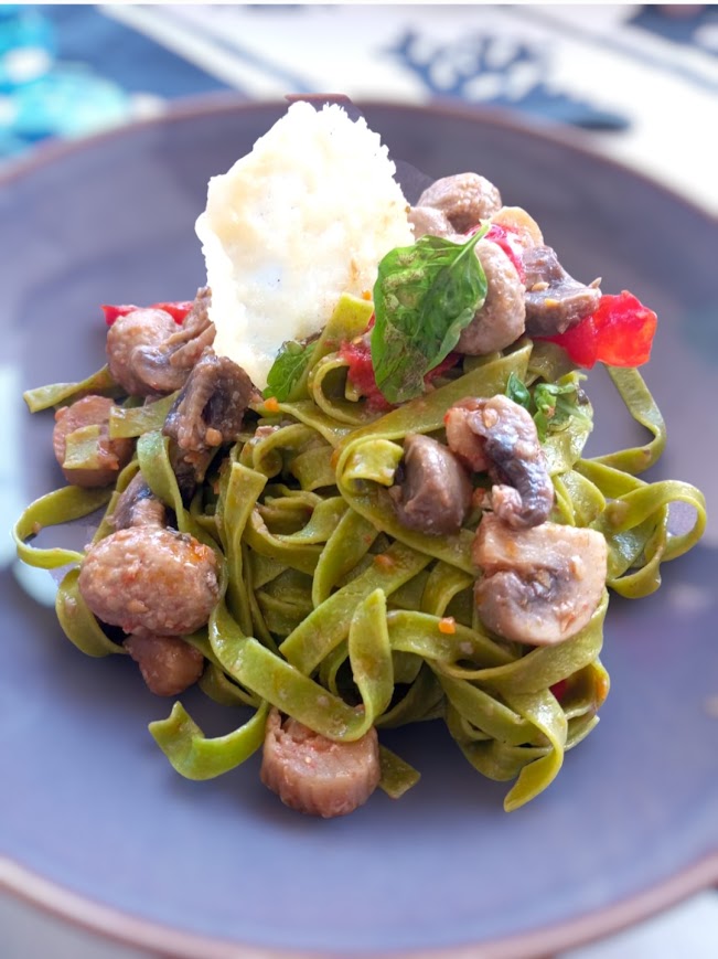 Tagliatelle agli spinaci con funghi, salsiccia e burro aromatizzato