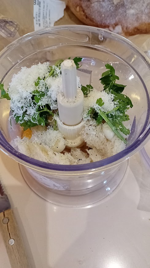 Nel tritatutto versate il predetto composto, aggiungete lo spicchio d’aglio privato del cuore, il prezzemolo, il formaggio pecorino grattugiato, sale, il pepe, l’uovo e un filo di olio evo.