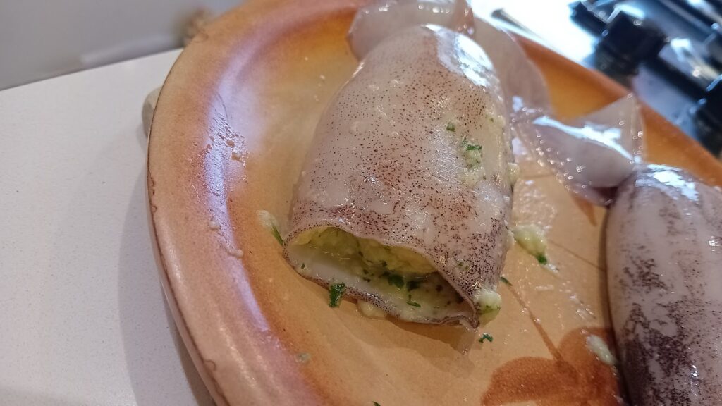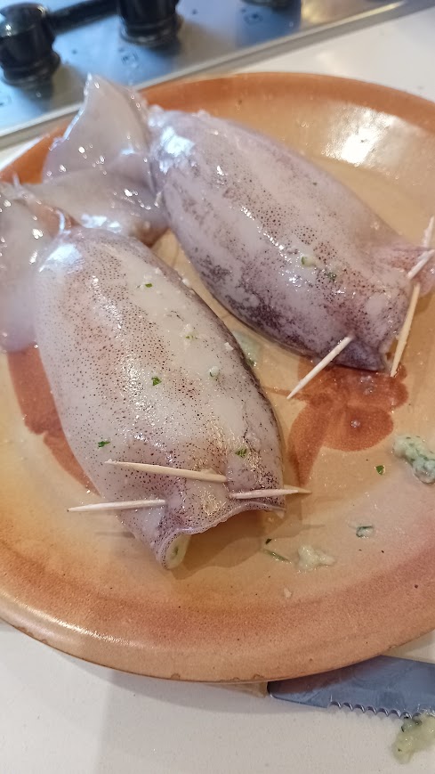 Riempite le sacche dei totani, chiudete con gli stuzzicadenti e riponete in frigo.