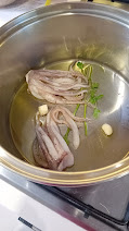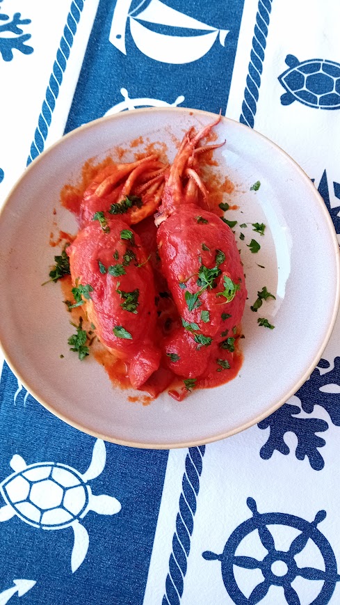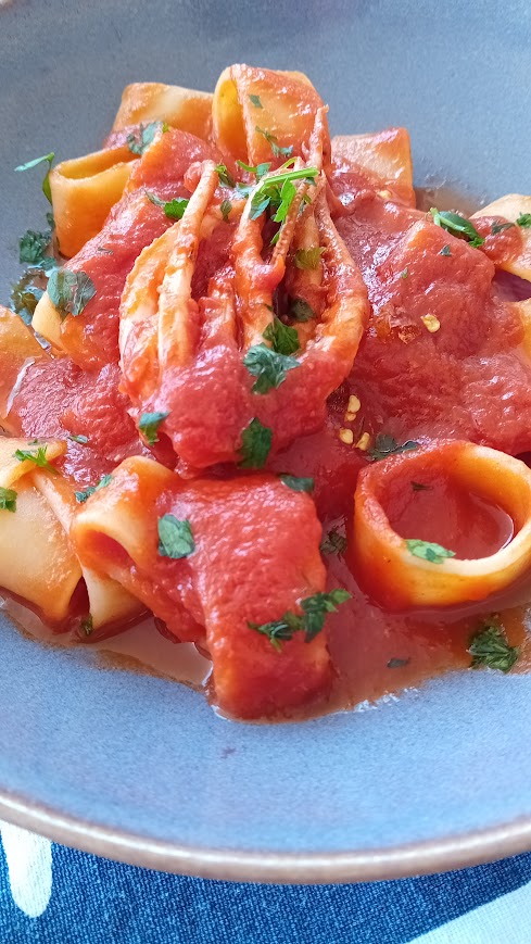 In acqua bollente e salata fate cuocere la pasta che andrete poi a condire col sugo e le teste dei totani aggiungendo del prezzemolo tritato e del peperoncino.